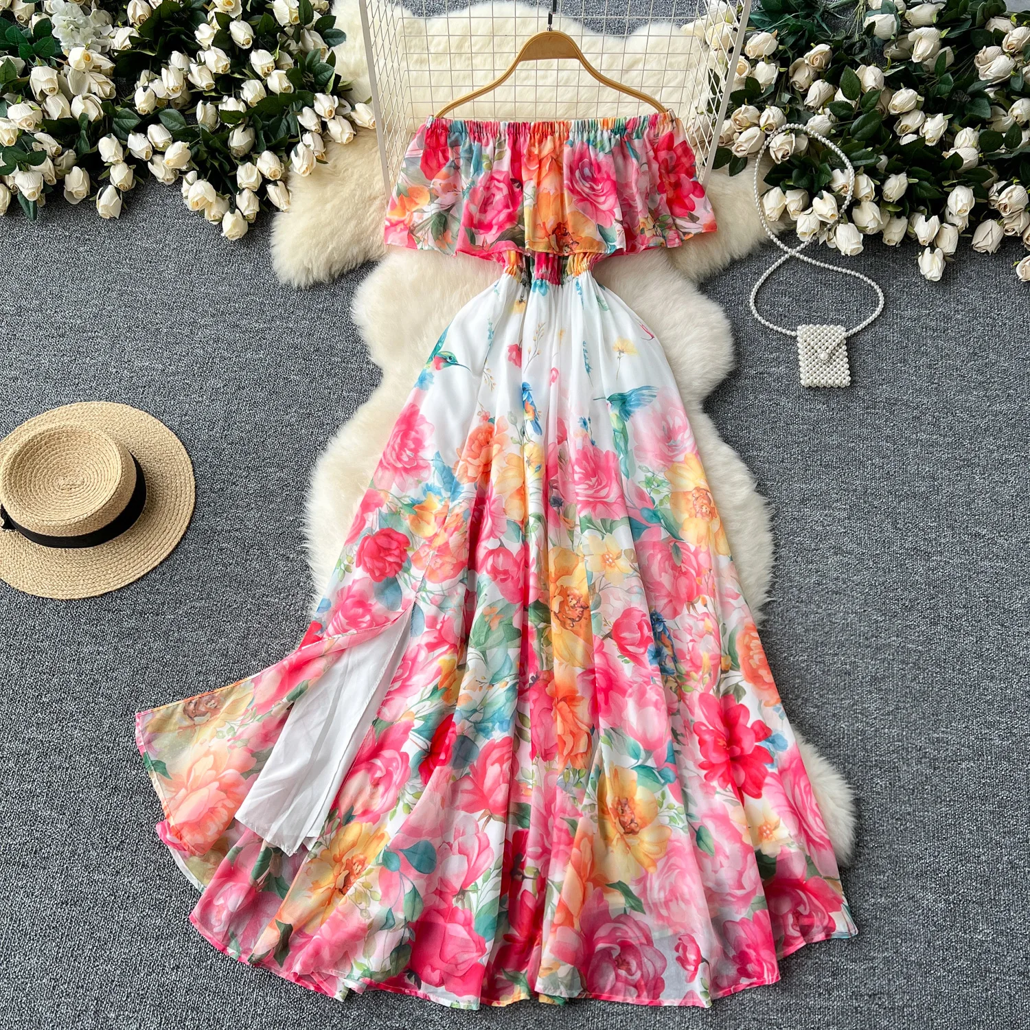 Customized One Shoulder Lotus Leaf Edge Waist Dress Women Large Open Hem Printed Chiffon Skirt